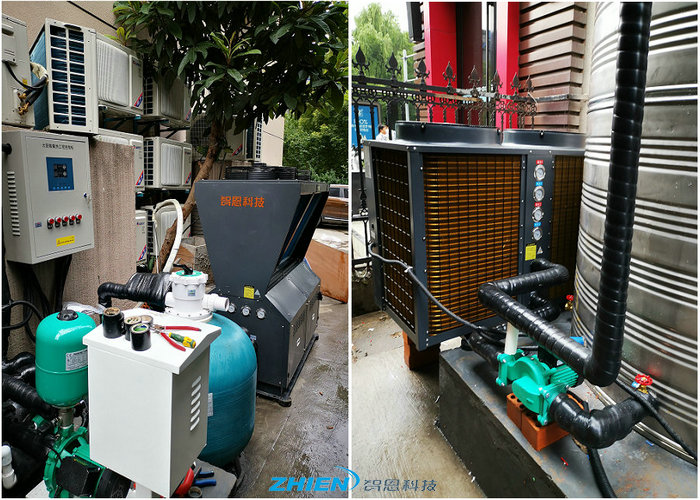 杭州全季酒店足浴、洗浴熱水工程采用智恩空氣能熱泵商用熱水系統:浴池循環熱水系統(空氣能熱泵浴池循環機+熱水循環泵)、空氣能熱泵洗浴熱水系統(空氣能熱泵熱水機+變頻增壓泵+保溫水箱)