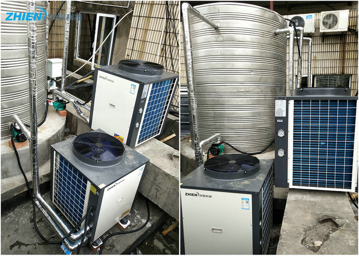 紹興酒店客房熱水項目采用了智恩空氣能2臺5匹機器( ZN-KFDX-050ll),5噸圓形不銹鋼保溫水箱。