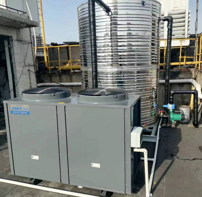 上海飛輪有色金屬有限公司的工廠熱水工程采用了智恩空氣能熱泵10P機+5噸水圓柱型不銹鋼保溫水箱。
