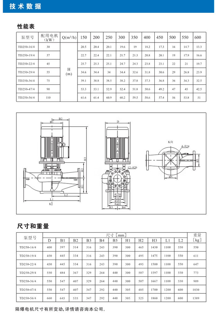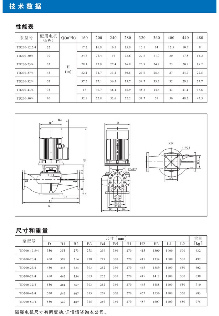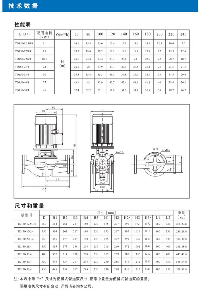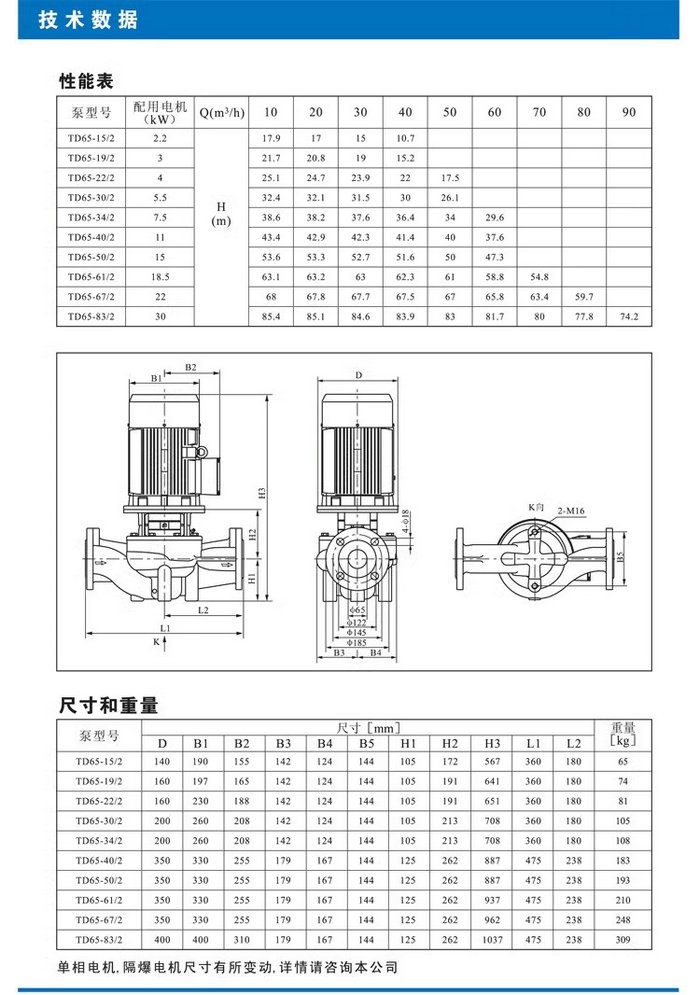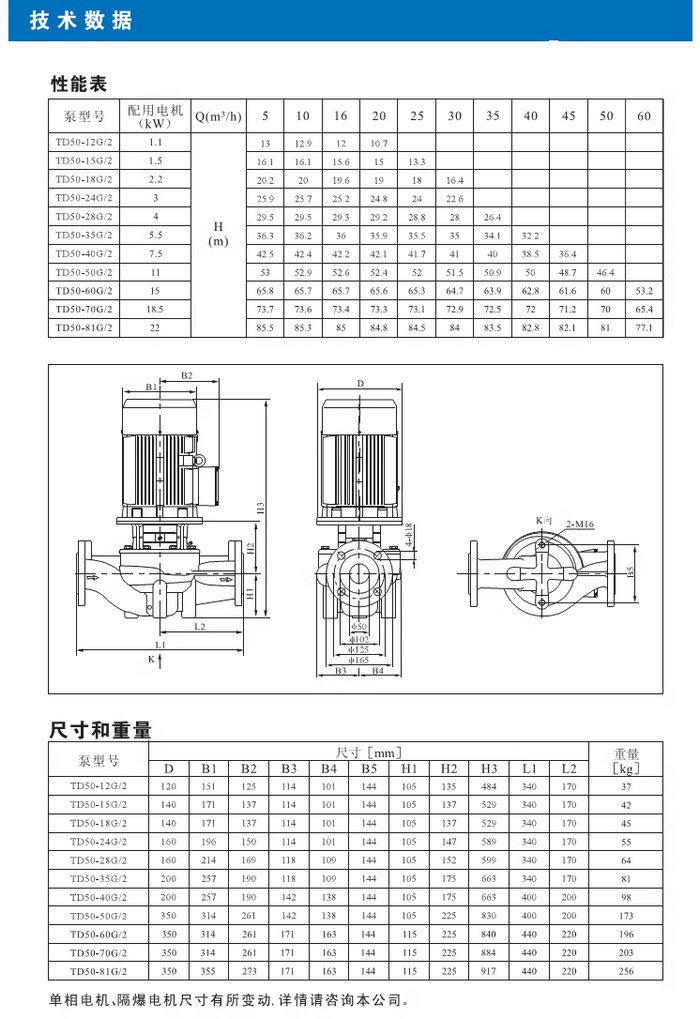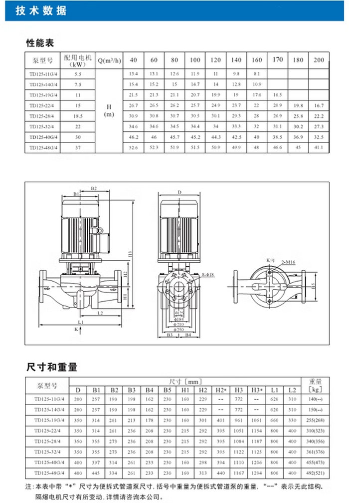 【南方】TD系列管道循環泵技術數據、性能參數、尺寸和重量